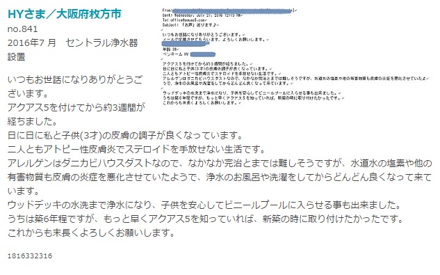 キッチンには一体型の浄水器、宅配の水も設置、そして今回お風呂の浄水もずっと考えていました。ネットで探していたら、(やっと見付けたこれこれ私が求めていたものは!)家中の水が浄水になる「アクアス5」を知り、設置完了まで何の迷いもなくでした。 家族も、お風呂でのチクチク感が無くなり目に水が入っても痛くないし、赤くなる事もなくなり、髪もサラサラ、肌もしっとりで申し分ありません。 お米洗いも今まで原水でしたが、全てが浄水になり本当に嬉しいです。 末永くよろしくお願い致します。幸福!