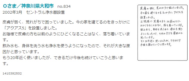 「アクアス5」にして早いもので3年が経ちました。 風呂に入れば肌の乾燥がなくなり、水を飲むと塩素臭がない事で毎日おいしいお水をたくさ飲めてとてもうれしいです! 「アクアス5」に出会えて本当に良かったです。