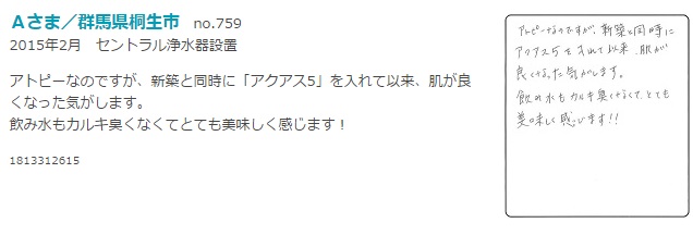 いつもお世話になっております。私どもの自社ビルでアクアスさんの浄水器を使わせていただいております。正直、メンテナンスの時期等、把握してないのですが、近くになるとちゃんと葉書でお知らせ下さいますので助かります。味もまろやかで刺激が全くなく、安心して飲めます。これからも宜しくお願い致します。