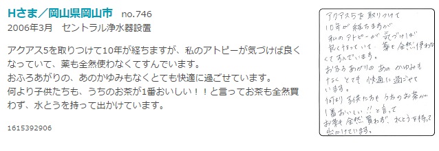 「アクアス5」を使い始めて12年経ちました。飲み水からおふろ、トイレなど全て「アクアス5」の水で安心して使えます。レストランなどでの水はへんな臭いが気になります。家以外のおふろは手荒れします。