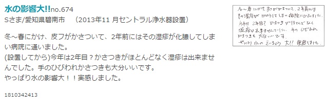 新築の家にアクアス5を設置して3ヶ月がたちました。妻と子供たちの肌荒れがすっかり良くなりました。今のところとても快適な生活です。飲み水としてもとてもおいしいので毎日冷蔵庫で冷やしてから飲んでます。