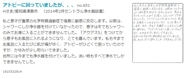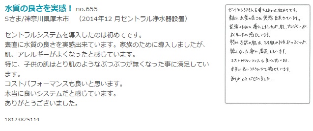 塩素の強い地域に住んでいたので、マンション購入を機に浄水器をつけました。引越(この地域)して、髪がバサバサ、肌はガサガサだった私が、今では髪はサラサラ、肌はしっとりです。本当にありがとうございます!