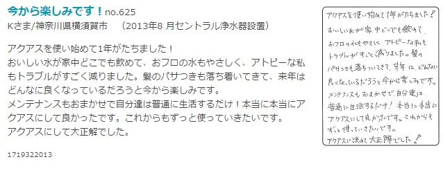 アクアス5をネットで知り、ビデオを見て設置することにしましたが、半信半疑なところもありました。実際に使ってみて、ごはんがおいしいのにビックリ、水もおいしく、お風呂も水のやわらかさが感じられとても気にいってます。 アトピーの子供が知り合いにいるのですすめました。