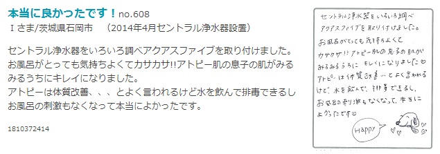 メンテナンスを自己管理せずに、お任せできるので安心して使用できます。アトピー性皮膚炎も気にならなくなり髪質も気付いたら「やわらかく」なっていました。家中の水が浄水できていてとても助かっています。