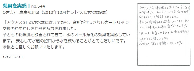 アクアス5の水にしてから丸2年が経ちました。息子のアトピーはあんなにひどかった(毎朝血があちこち出て傷だらけ)のが、今は部分的にザラついてるだけです。もちろん他の努力もしてるので水だけで良くなったとは思いませんが大きな役割を占めていると思います。「安心して使える、飲める水」に感謝!!です。