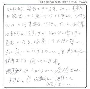 私は、美容室を経営させて頂いているのですが、やはり水は、とても重要なアイテムでして、お客様はもちろん、スタッフのシャンプー時の手の負担になる塩素、トリハロメタン等が0(ゼロ)に近いというのはとてもありがたく使用させて頂いています。