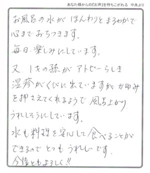 設置2年目です。ろ材交換の際、会社の対応がとても丁寧で安心しました。こちらの浄水器を選んで良かったと思いました。