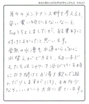 仕事を辞め、結婚し、子どもが出来...そして、今夏に新築を購入しました。「ぜひ、セントラル浄水器を設置したい!!」という希望があったので、調べに調べ以前の価格より安く、メンテナンスも安心できる御社にたどりつきました。