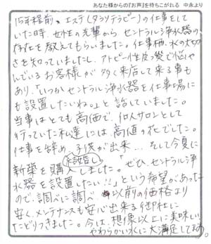 15年程前、エステ(タラソテラピー)の仕事をしていた時、女性の先輩からセントラル浄水器の存在を教えてもらいました。