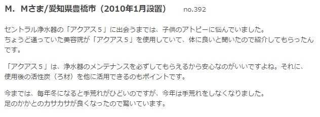 喫茶店で出されるお水は塩素は臭って、飲む事が出来ませんでしたが、主人は平気で飲んでいたのに、セントラル浄水器「アクアスファイブ」を取り付けてから、段々と水に関心が出、今では食堂や喫茶店の水が「飲めない」と言うようになりました。