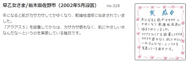 これは、オール浄水システム・アクアス5を選んだ人たちの、リアルなお声です。暮らしの中の実感とともに、カテゴリごとにご紹介します。