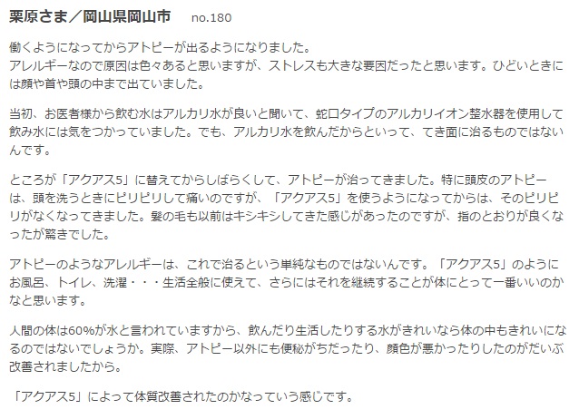 これは、オール浄水システム・アクアス5を選んだ人たちの、リアルなお声です。暮らしの中の実感とともに、カテゴリごとにご紹介します。